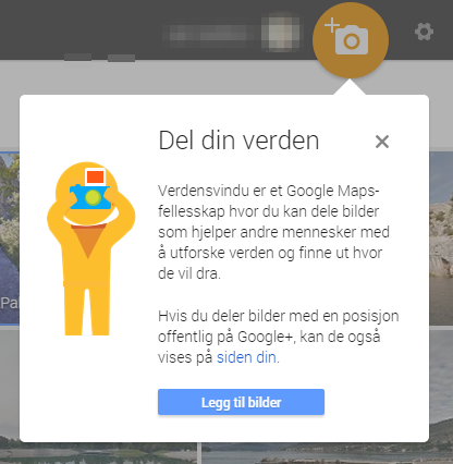 Google Verdensvindu («Google Views») finner du på denne linken, og er en del av Google Maps. Her kan du legge inn bilder ved å bruke knappen øverst til høyre: