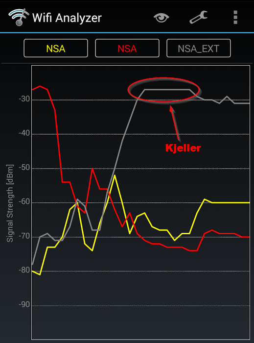 I illustrasjonen ovenfor kommer nettverksutvideren opp som egen graf – denne er grå her (den gule grafen er ytterligere én nettverksutvider som jeg satt i mellometasjen, men den var noe svakere enn den som ble satt i kjelleren, så den er trolig ikke nødvendig). Som illustrasjonen viser, så er styrken på signalene fra det trådløse nettet det samme nå i kjelleren som det er rett ved siden av den trådløse ruteren i stuen.