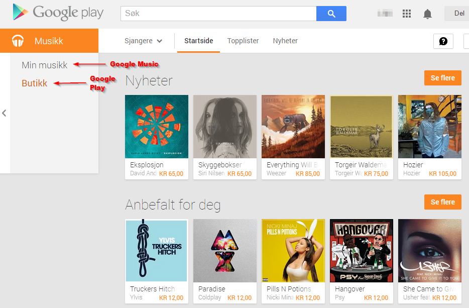 Fra Google Music kan du også gå til Google Play for å kjøpe musikk og lydbøker. Musikk og lydbøker du kjøper i Google Play blir selvsagt tilgjengelig i Google Music for deg senere. Musikk du kjøper fra Google Play regnes ikke med i grensen på 20.000 egne sanger, så du kan kjøpe så mye du vil uavhengig av hvor mange private sanger du har i samlingen din.