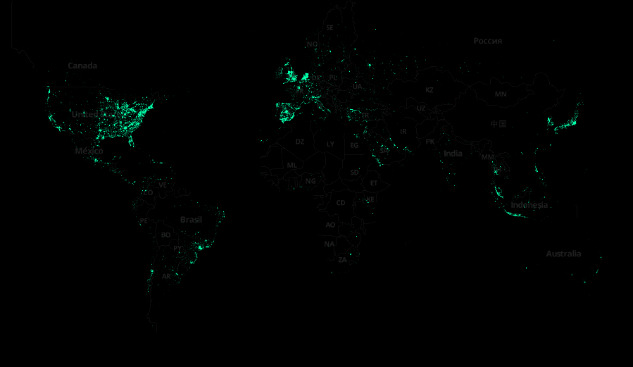 Tilsvarende å se verden total er også mer spennende. Her ser man klart at det er veldig stor bruk av Android i Spania og Indonesia, men ellers er det vanskelig å se noen forskjell. Det er også mer bruk av Android i Tyskland,