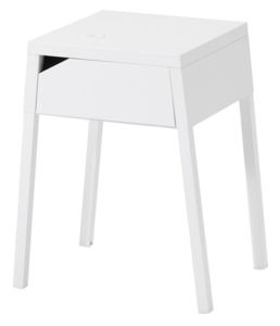 IKEA har kommet med trådløs ladning som både er integrert i møbler, som lamper og nattbord, eller som selvstendige løsninger, både mobile og til å integrere i andre møbler som lamper og som dette nattbordet: