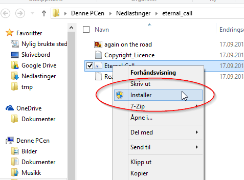 Etter filene er pakket ut, høyreklikker du på filen som inneholder fonten. Denne vil som regel ha et ikon med en «A» på, se nedenfor. Du velger «Installer» på menyen som dukker opp: